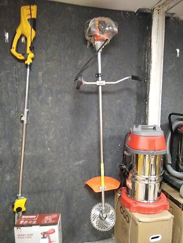 - Электрический триммер (жёлтый блок двигателя) — лёгкий и манёвренный, для подравнивания кромок и труднодоступных мест.