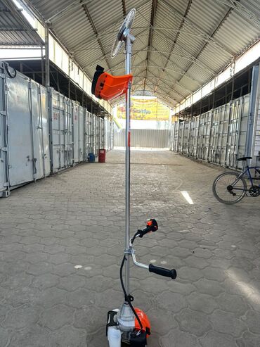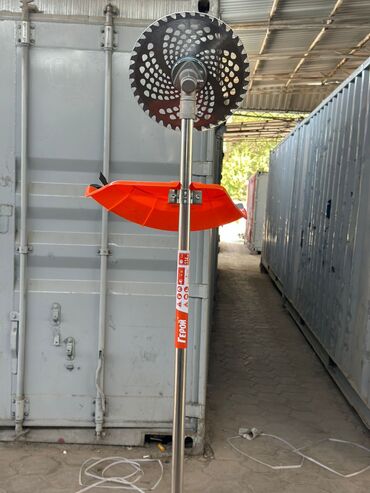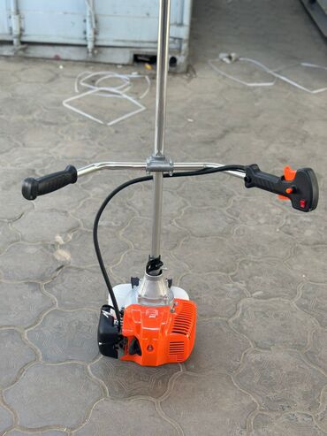 В комплекте на фото: штанга с редуктором и диском, двигатель, защитный кожух, рукояти с газом/стопом, топливный бак.