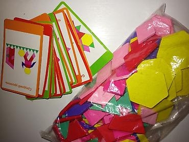 - Набор для обучения формам и цветам: разноцветные геометрические фигуры (треугольники, квадраты, ромбы, трапеции, шестиугольники и др.) из плотного материала.