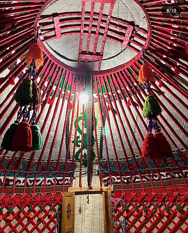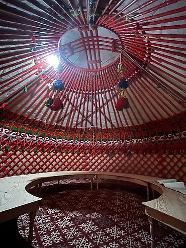 Аренда юрты с полом, 24/7 - Традиционная кыргызская юрта с деревянным каркасом и декоративной отделкой. - Пол: настил с национальными войлочными коврами (ширдаками) для комфортного размещения гост...