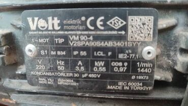 - Электродвигатель Volt Elektrik Motor: тип VM90-4 (V2SPA90S4AB3401SYY), 1~ фаза, 220 В, 50 Гц, 3.5 А, мощность 0.55 кВт, cos φ 0.97, 1440 об/мин, класс защиты IP55, исполнение IM B34, конденсатор 30 мкФ 450 В, стандарт IEC 60034, IE2.