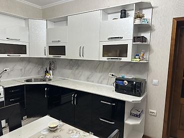 Кухонный гарнитур угловой, современный, двухцветный (верх — белый глянец с фактурными фасадами, низ — черный глянец).
