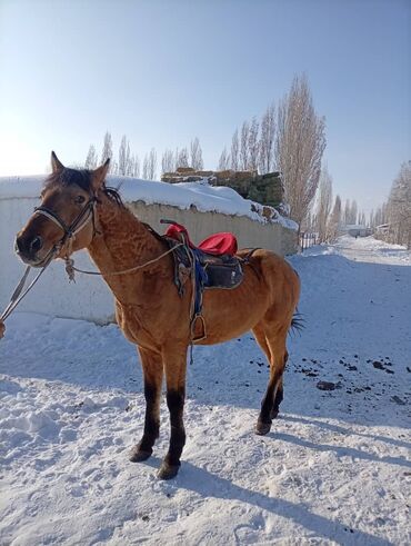 Лошадь гнедо-саврасого окраса с темным хвостом и гривой. На фото видно рабочую упряжь и седло; конь ходит под седлом и на поводу. Пропорциональное телосложение, крепкие конечности, выраженные суставы и копыта, темные «чулки» на ногах. Подходит для верховой езды и хозяйственных работ. Спокойная посадка, принимает уздечку и недоуздок, стоит привязанный, уверенно движется шагом и рысью. Удобная высота, развитая грудь, хороший объем корпуса. Оптимален для прогулок, пастбищной работы, выездов по пересеченной местности в зимних условиях.