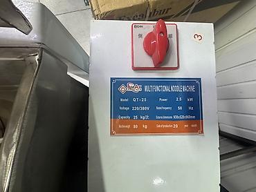 Многофункциональная лапшерезка модели QT-25 предназначена для замешивания теста с производительностью до 25 кг/ч. Она оснащена двигателем мощностью 2,5 кВт и работает от сети 220/380 В с частотой 50 Гц. Чаша для замешивания и крышка выполнены из нержавеющей стали, обеспечивая гигиеничность и долговечность. Устройство имеет прочную конструкцию и оснащено красным поворотным выключателем для удобного управления.