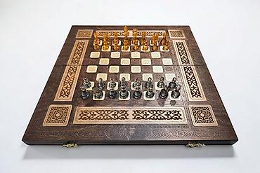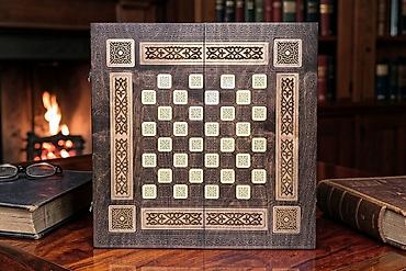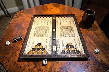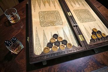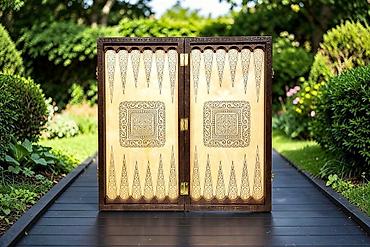- Нарды: внутренние створки с детальной гравировкой, длинные треугольники, стартовые позиции. В комплекте фишки двух цветов (с узорной верхней поверхностью) и игральные кости.