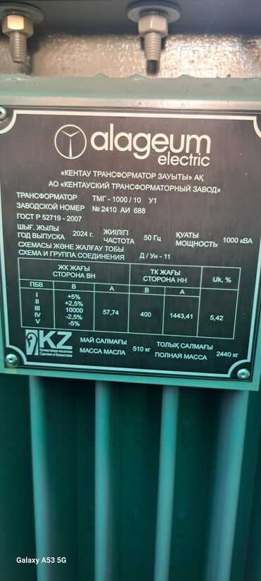 Масляный силовой трансформатор Alageum - Тип: трехфазный, масляного охлаждения (радиаторные секции по бокам) - Производитель: Alageum (табличка завода «Alageum Electric», KZ) - Номинальная мощност...