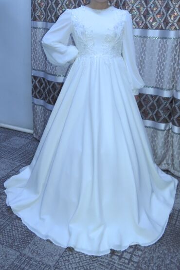 Свадебное платье, S, Дизайнерское, Закрытое, Мусульманское, Шелк, А-силуэт, Кыргызстан, Жемчуг, Кружево, Стразы, Б/у
