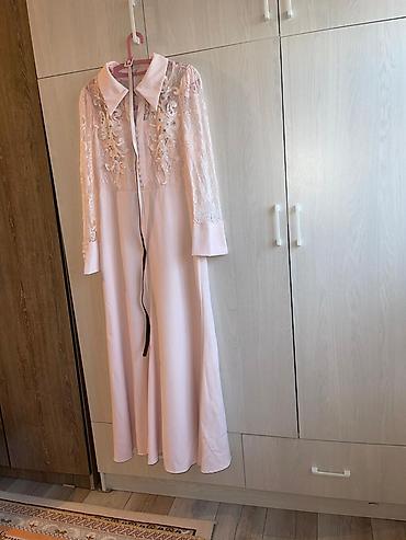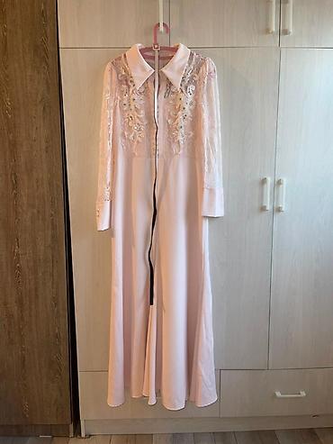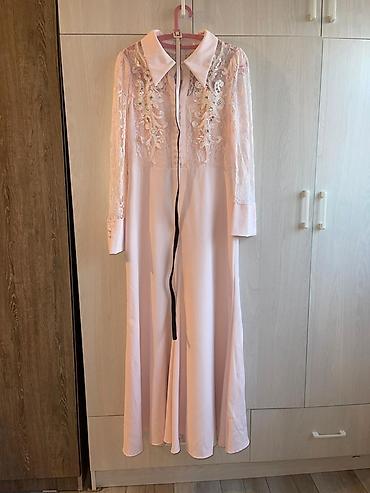Платье макси пастельно-розового цвета с кружевным верхом.