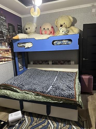 - Двухъярусная кровать: верхний ярус с защитными бортами синего цвета, нижний — широкий спальный модуль формата двуспальной кровати. Боковая секция с лестницей-полками для подъёма на верхний ярус.