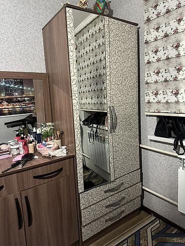 - Туалетный/комодный стол с большим зеркалом: две тумбы с распашными дверцами, верхняя столешница под косметику и аксессуары, широкая рама зеркала в тон корпуса. Цвет корпуса мебели — «орех/венге» с контрастными чёрными ручками.