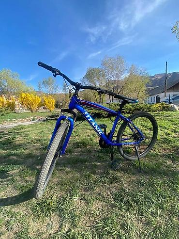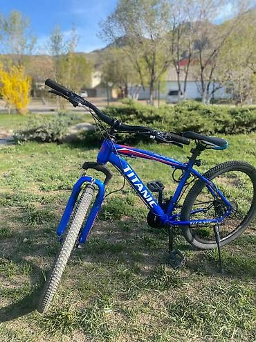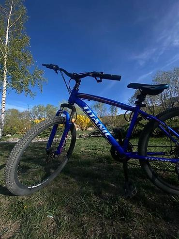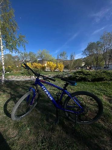 Горный велосипед TITANIC, с колесами 26". Легкая стальная рама, передняя амортизационная вилка для комфортного прохождения неровностей. Покрышки с выраженным протектором для грунта и городских дорожек. Прямой рууль с грипсами, удобное седло с регулировкой высоты. Навеска с задним переключателем передач, цепь на системе с тремя звездами спереди (многоскоростная трансмиссия). Ободные тормоза V-brake. Подножка установлена. Педали платформы.
