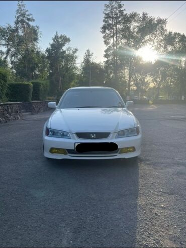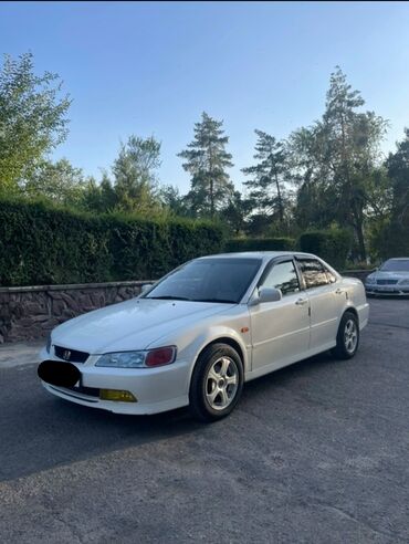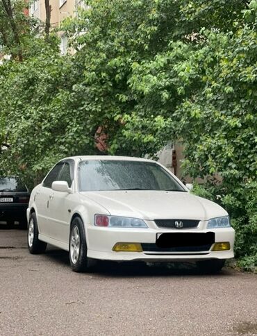 Honda Accord седан, правый руль (JDM-версия). Белый цвет кузова, оригинальная эмблема Honda на решётке. Компактный спортивный внешний стиль: низкий передний бампер с интегрированными желтыми противотуманными фарами, узкие головные фары с прозрачными линзами, аккуратные повторители поворотников на крыльях. Лёгкосплавные диски, окрашенные в серебристый цвет. Аэродинамический передний спойлер, окрашенные в цвет кузова зеркала и ручки дверей.