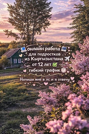 Написано на изображениях: «Подработка для подростков онлайн», «Онлайн работа для подростков из Кыргызстана от 12 лет, гибкий график. Напиши мне в лс и я отвечу».
