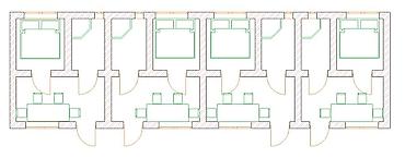 • Линейный блок из повторяющихся модулей общежития: секции с двухместной спальней, выделенным входным узлом/тамбуром и обеденной зоной. Повторяемость модулей позволяет наращивать длину корпуса под нужное количество мест.