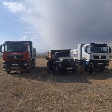 На фото — машина в сравнении с современными самосвалами HOWO, что показывает компактные габариты и удобство маневрирования на тесных площадках. Номерные знаки киргизской регистрации.
