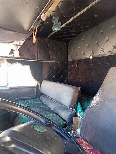 - Кабина: спальное место, перетянутая шумо‑ и термоизоляция, полка, потолочные рейлинги, декоративная обшивка, шторка на лобовом. Сиденье с чехлом, панель приборов стандарт КамАЗ, механическая коробка передач с напольным рычагом.