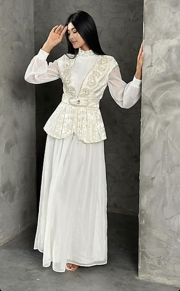 Эстетика: сочетание минималистичного белого платья с изящными кружевами и акцентными жилетами в восточном стиле с богатыми жемчужными орнаментами. Подчеркивает талию и сохраняет деликатную закрытость образа.