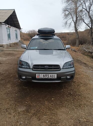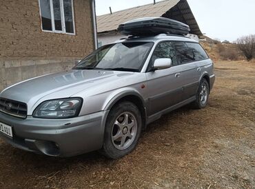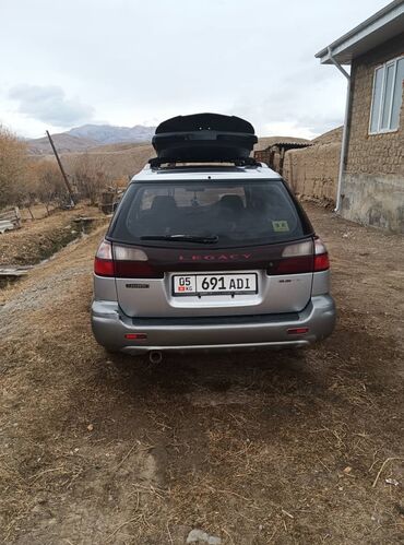 Универсал Subaru Legacy серебристого цвета с дополнительным багажным боксом на крыше. Автомобиль оснащен рейлингами для установки багажника. Дизайн кузова характеризуется плавными линиями и двухцветной окраской нижней части бамперов и порогов в более темный оттенок. Модель имеет характерные для Subaru Legacy фары и задние фонари. На задней двери багажника присутствует надпись "LEGACY". Автомобиль подходит для повседневного использования и путешествий.