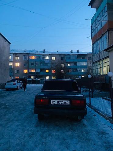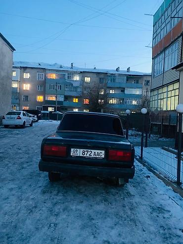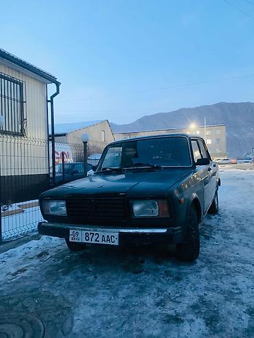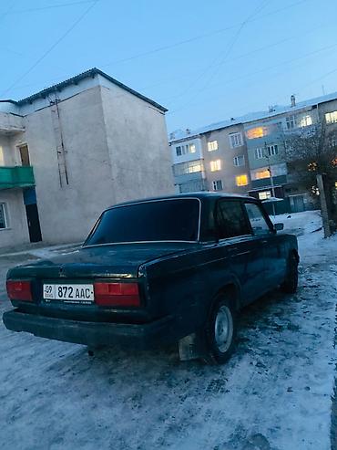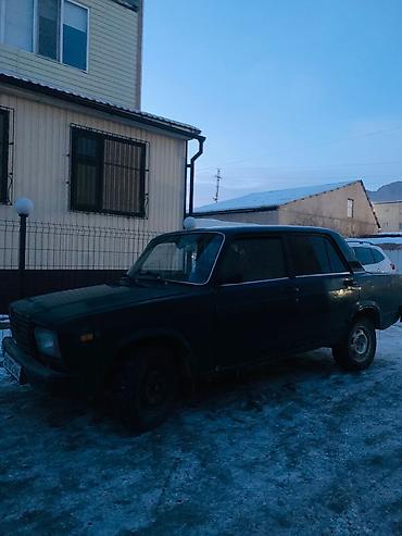ВАЗ 2107, седан, темно-зелёный цвет. Классическая «семёрка» с задним приводом и четырьмя дверями. Кузов в стандартном исполнении: хромированные молдинги, прямоугольные передние фары, черная решётка радиатора, крупные бамперы. Тонированные стёкła, брызговики сзади. Стальные диски, зимняя резина установлена. Задние фонари классического образца, наружные зеркала черные. Салон тканевый (видны накидки на передних сиденьях). Кыргызские номера региона 09.