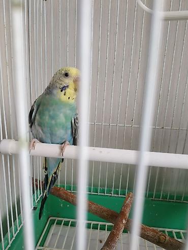 Волнистый попугай в клетке. - Окрас: нежно‑голубой с желтой головкой