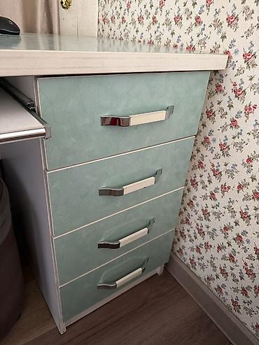 - Справа тумба с четырьмя выдвижными ящиками на направляющих; фасады мятного цвета, ручки — металлические с светлыми вставками.