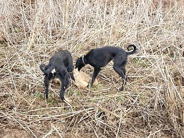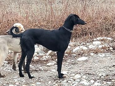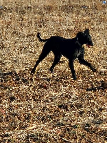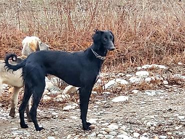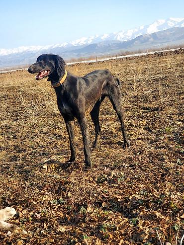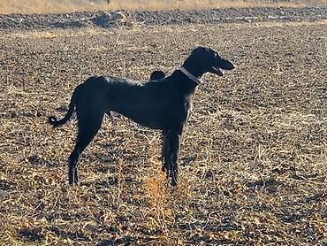 Собака крупного типа, белая с чёрными пятнами. Плотный костяк, широкая