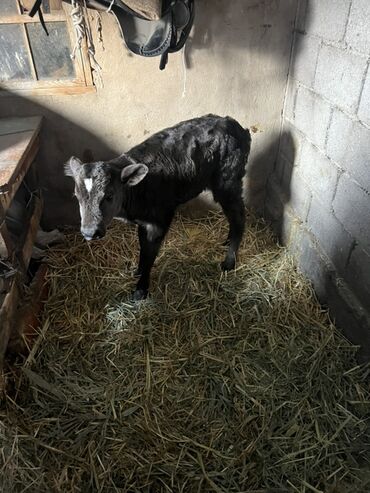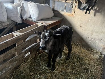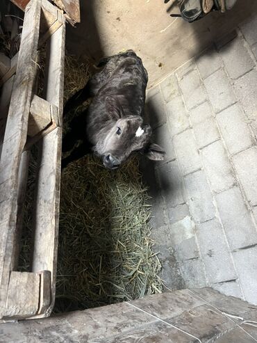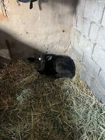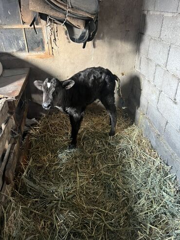 Бык-производитель, чёрно-пёстрый окрас. Крупный, сильный, с широкой грудью и хорошо развитыми мышцами. Содержится в крытом загоне, на привязи, с кормушкой для сена. На фото — реальное животное, спо...
