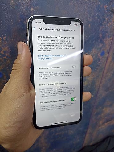 - Состояние аккумулятора в настройках: максимальная ёмкость 74%, отображается важное сообщение о необходимости сервисной замены.