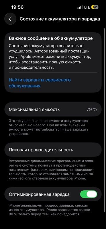 - Состояние аккумулятора в iOS: максимальная емкость 79% (на экране системы показано важное сообщение о необходимости замены аккумулятора для восстановления полной емкости и производительности). Включена функция «Оптимизированная зарядка».