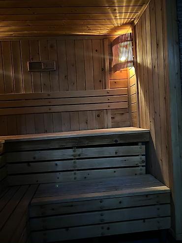 - Просторная финская парилка из натурального дерева с многоуровневыми полками и мягким приглушённым светом.