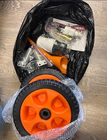 - Комплектация: колёса для транспортировки (оранжевые, с шинами), крепёж и кронштейны, ручка/воронка для заливки топлива, свечной ключ, кабели/клеммы для 12V, документация.