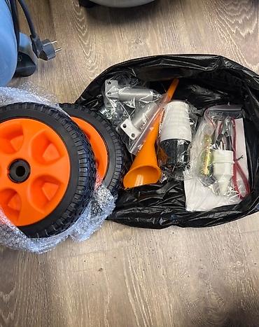 - Комплектация (на фото): колеса и оси для транспортировки, кронштейны/крепеж, ручка, пластиковая воронка, свечной ключ, набор инструментов, переходной штекер 220V.