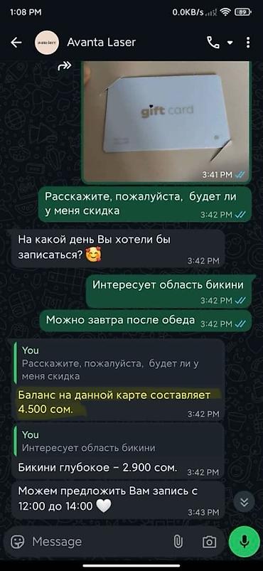 Подарочный сертификат на процедуры Алесандритового лазера (в разы эффективней чем диодный) в Avanta Lazer для удаления навсегда нежелательных волос на теле. Баланс сертификата 4500 сом! Можете провести пару процедур бесплатно. Можете связаться с салоном и проверить сами. Один сертификат я уже сама использую, есть еще этот неиспользованный сертификат. Обменяю на другую вещь, предложите (посуда, стиральный порошок, 3кг риса ) или за деньги.
