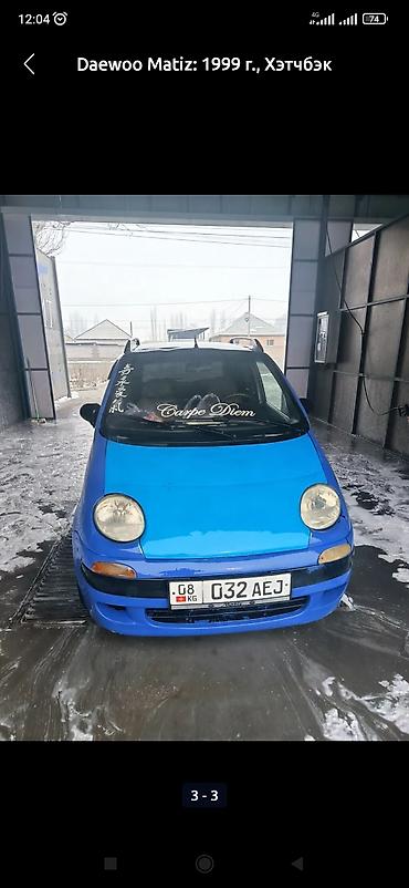 Daewoo Matiz, 1999 год, хэтчбек. Компактный городской автомобиль синего цвета с чёрными элементами бамперов. 5 дверей, ветровики на крыше/рейлинги, задний спойлер, задний стеклоочиститель. Круглые передние фары, противотуманные поворотники в бампере. Лобовое с декоративной надписью «Carpe Diem», тонировка задней части. Черные стальные диски, зимние шины на фото. Номерной знак KG 032 AEJ (08 регион). Удобный для города формат кузова с хорошей обзорностью и небольшим радиусом разворота. Отлично подходит для повседневных поездок и парковки в тесных дворах.