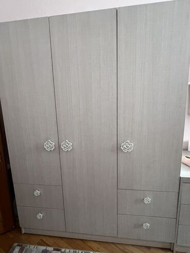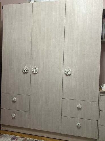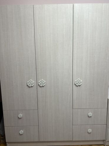 - Шкаф трехстворчатый светлого древесного оттенка с вертикальной текстурой. На фасадах декоративные ручки-розочки. В нижней части — выдвижные ящики с обеих сторон.