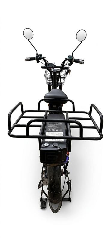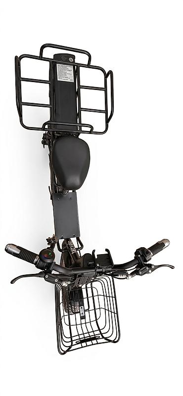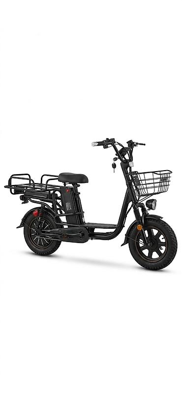 Электровелосипед/электроскутер компактного формата с низкой рамой и корзинами. Основные особенности: - Электромотор в заднем колесе (редукторная ступица). - Передняя вилка с пружинной амортизацией...