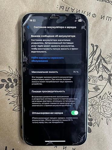 - Аккумулятор: максимальная ёмкость 74% (на экране показано уведомление о необходимости обслуживания аккумулятора)