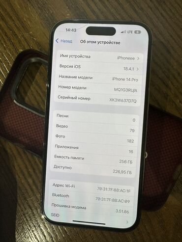 IPhone 14 Pro Max, 256 ГБ, цвет Deep Purple Характеристики и детали с устройства: - Модель: iPhone 14 Pro Max (номер модели MQ8A3ZA/A) - Память: 256 ГБ (доступно около 233,39 ГБ) - iOS: версия 18....