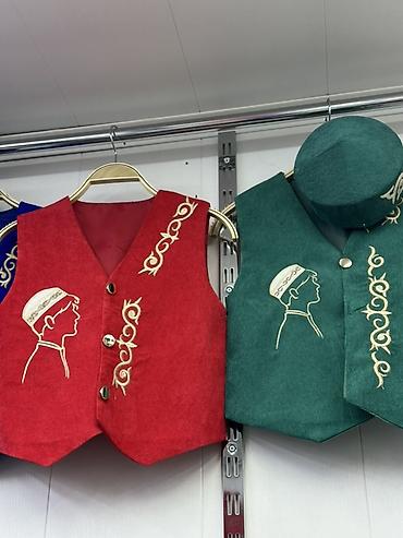 Детские национальные комплекты (для мальчиков и девочек) - Жилеты из плотного бархата: черный или изумрудно‑зеленый. - Традиционный золотой вышитый орнамент и силуэтный рисунок (мальчик/девочка) н...