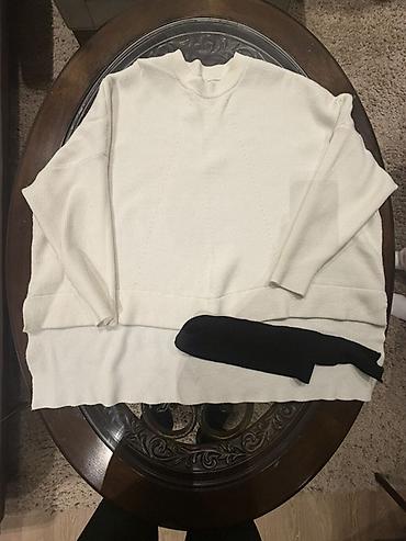 - Свитер свободного кроя с высоким округлым воротом, спущенным плечом и широкими манжетами/низом. В комплекте съемный темный пояс-лента для акцента на талии.