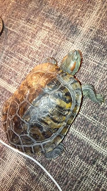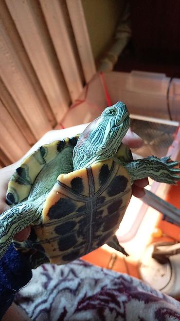 - Активная водная черепаха с яркими красными «ушками» и выразительным рисунком на панцире и коже.