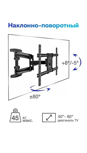 Поворотный настенный кронштейн для телевизоров с диагональю от 40 до 80 дюймов. Подходит для телевизоров весом до 45 кг. Обеспечивает регулировку угла наклона и поворота экрана для комфортного просмотра из любого места в комнате. В комплекте поставляется набор крепежных элементов для установки.