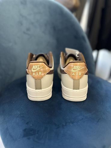 - Цветовое решение: бежевый/кремовый верх с коричневым Swoosh и коричневыми шнурками; пятка и язычок с клетчатой вставкой в карамельно‑коричневых тонах.