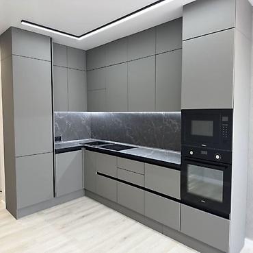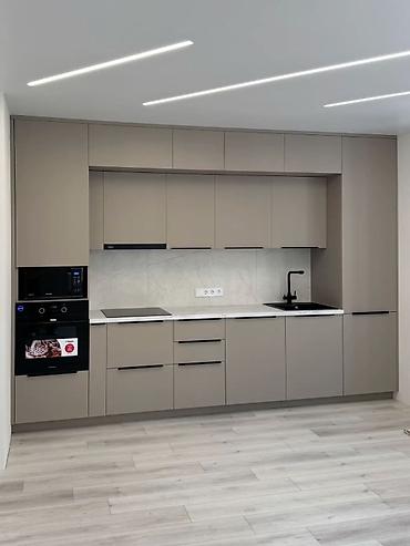 - Фасады: гладкие, без ручек или с интегрированными профилями/скрытыми ручками; матовые нейтральные тона (серый, беж, белый).