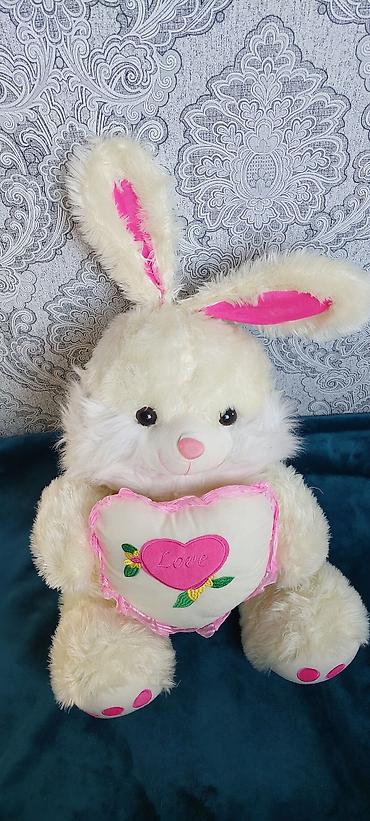 - Пушистый зайка с длинными ушами и подушечкой-сердцем с надписью «Love».
