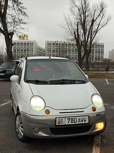 Daewoo Matiz, 5‑дверный хэтчбек, белый с серыми бамперами. Киргизские номера. Основные особенности: - Компактный городской автомобиль, удобный для узких улиц и парковок - Бензиновый мотор, передни...