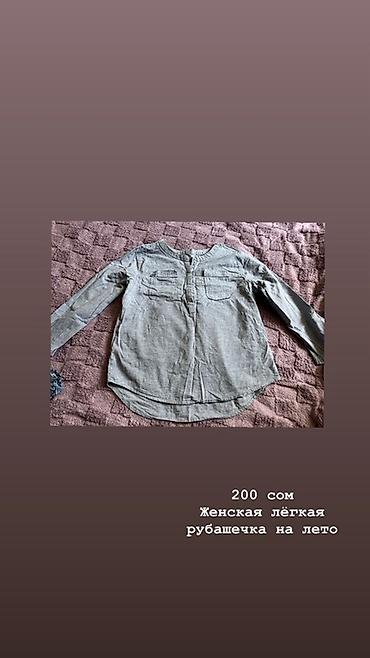 1) Женская лёгкая рубашка на лето — светло-серая, тонкая ткань, длинный рукав, круглый вырез без воротника, планка на пуговицах до середины, два нагрудных кармана с клапанами, закруглённый низ. 200 сом.