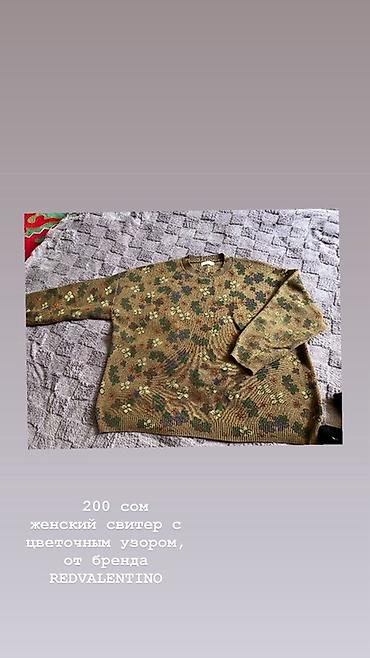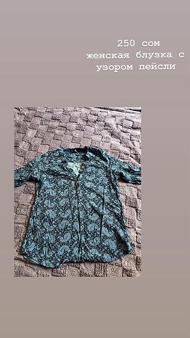 2) Женская блузка с узором пейсли — тёмная база с голубыми завитками, лёгкая струящаяся ткань, длинный рукав, V-образный вырез с планкой. 250 сом.