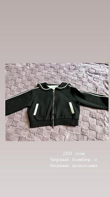 4) Чёрный бомбер с белыми полосами — укороченный, фактурный трикотаж, молния спереди, контрастные белые лампасы на рукавах и отделка карманов, эластичная резинка по низу. 200 сом.
