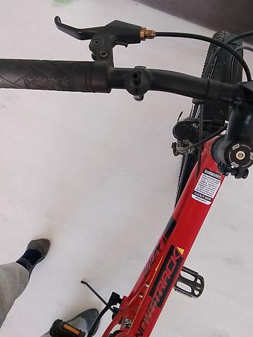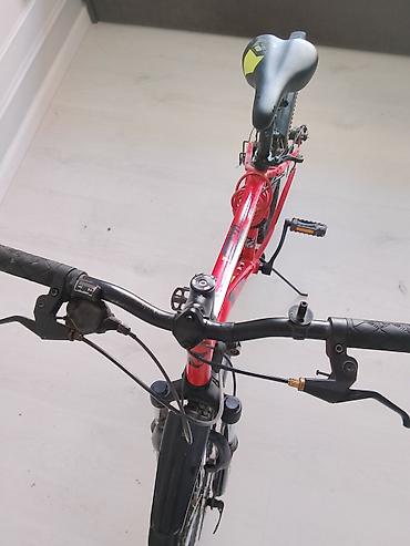 Горный велосипед 26" - Рама: стальная, размер ориентировочно M, цвет красный с белыми элементами. - Подвеска: передняя вилка с пружинной амортизацией. - Колёса: 26", двойные обода, покрышки полусл...
